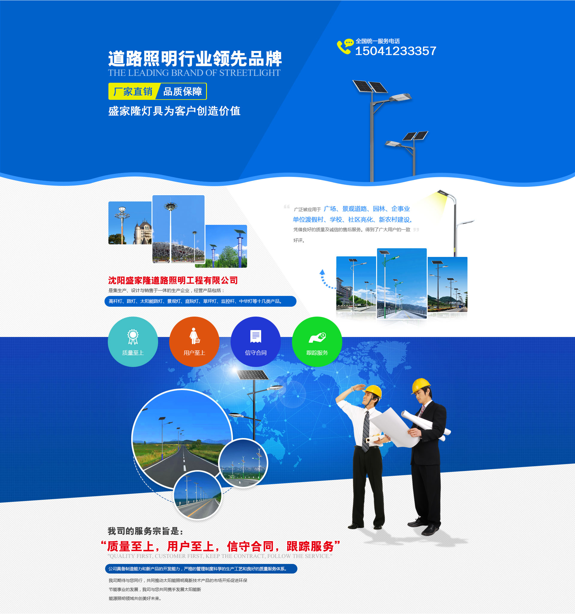 沈陽盛家隆道路照明工程有限公司坐落于沈陽市于洪區(qū)興盛村愛國,生產各種室外,道路,廣場,車站,碼頭,橋梁,庭院及室內工礦照明燈具,品種有太陽能路燈,道路燈,LED路燈,組合燈,景觀燈,庭院燈,草坪燈,彩色泛光燈,中高桿燈以及配套使用的各種路燈頭,鎮(zhèn)流器,觸發(fā)器開關箱等系列產品。 本公司自成立以來,已初具規(guī)模,現(xiàn)有高級技術人員5人,中級技術人員28人,研究設計人員14人,車間工人百余人,并備有大型斬彎機,1600t-900t壓鑄機,20t行吊,高速縱剪機,埋弧自動焊,彩色噴塑線燈先進設備,高科技創(chuàng)造高質量,由我公司生產的各種類型的照明燈具,不僅質量可靠而且線條流暢,外形美觀,深受廣大客戶的喜愛,長期以來,我公司一直注重產品質量,堅持“質量是企業(yè)的生命”的宗旨。由于質量可靠,價格合理,服務周到,從而贏得了廣泛的市場聲譽。企業(yè)先后被評為“質量信得過企業(yè)”“重誠信守信用企業(yè)”,“AAA級資信企業(yè)”,并通過ISO9001:2000國際質量體系認證,ISO14001:2004環(huán)境管理體系認證,CCC,CQC國家強制性產品認證和持有道路照明二級安裝,安全生產資質。